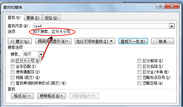 ①区分大小写:若选中此项,在查找时会区分英文字母的大小写。