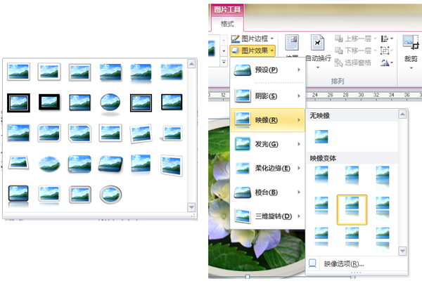 第四,单击【图片工具】→【格式】→【图片样式】→【图片效果】→【映像】,从列表中选择“半映像,接触”。如图 3-55的右图所示。
