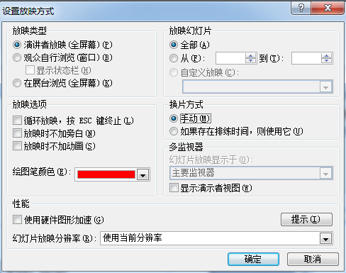 在【幻灯片放映】选项卡下,从功能区的【设置】区域找到【设置放映方式】按钮,单击它后将弹出【设置放映方式】对话框,如图5-37所示,能够设置当前文稿的放映方式。