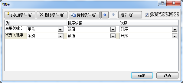 第三,在图6-30所示的对话框中,单击【主要关键字】边缘的下拉按钮,选中【系别】字段,在【次序】下拉列表框中选择【升序】。